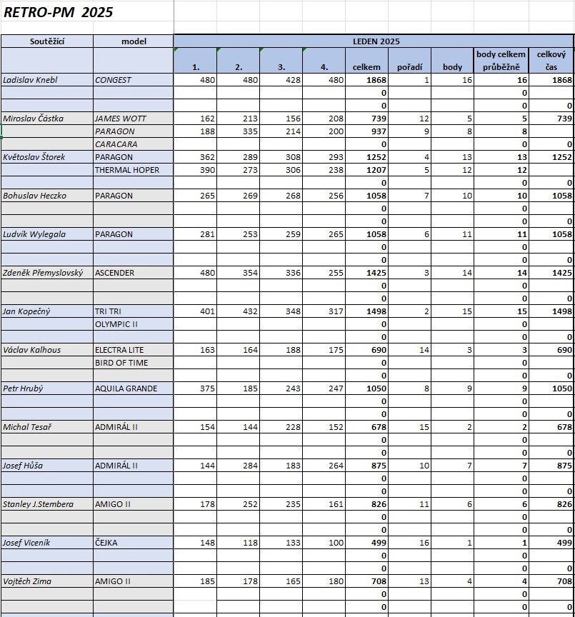 Vítám Všechny nadšené Retro letce, kteří začali naplno prohánět své stroje už od prvního měsíce roku 2025. Přiznám se, že takovou účast hned na začátku jsem nečekal a velmi mě to potěšilo. V lednu létalo 16 modelů!  Věřím, že se k nám se vzrůstajícími teplotami a s prodlužujícími se dny připojí ještě další modeláři, kteří dosud váhali.