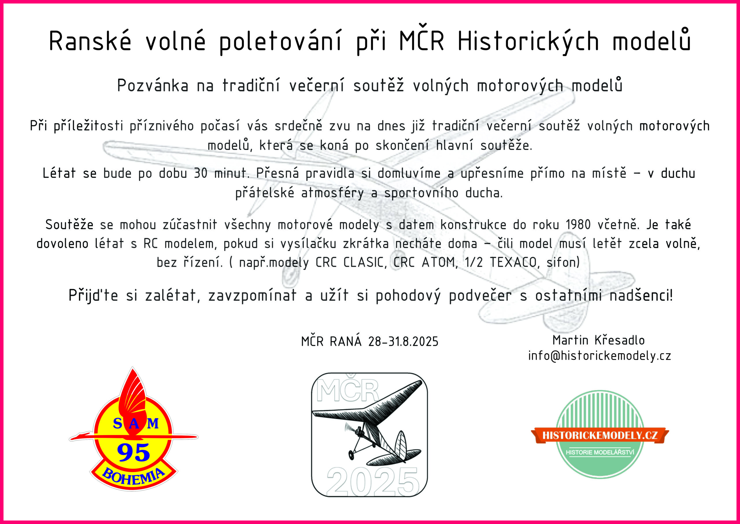 Pozvánku na webu našich kolegů ze SAM 95 určitě už máte naštudovanou a možná jste už i přihlášení, protože termín uzávěrky 10.8.2025 se blíží. Hlavní program je tedy jasný. Co možná ale nevíte je, že se chystají i další doprovodné akce.
