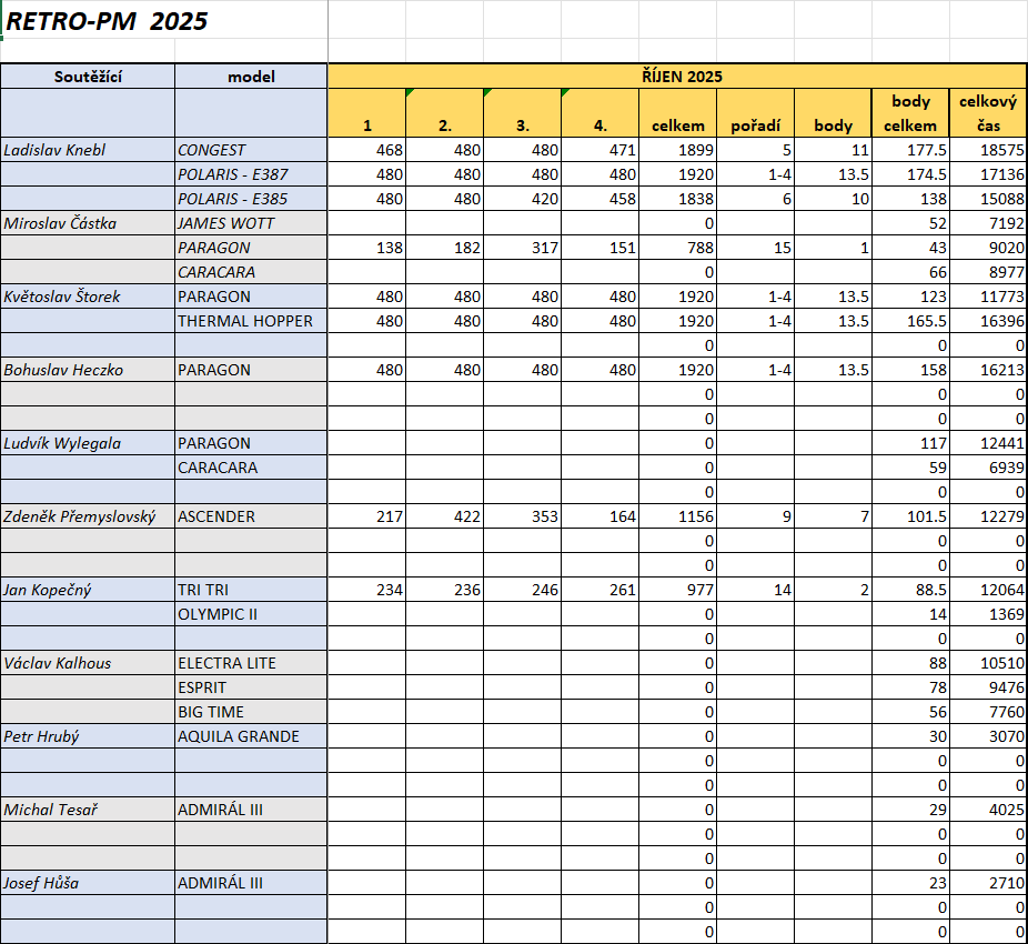 V říjnu se spolu utkalo 15 modelů což vzhledem k počasí a krátícímu se dni lze uznat za slušnou účast. Gratuluji soutěžícím , kteří trefili dobré podmínky a nalétali plný počet bodů. V tomto měsíci se to podařilo čtyřem modelům , což je skvělý úspěch. Všem bez rozdílu děkuji za posílání výsledků a podělení se o dojmy z létání.